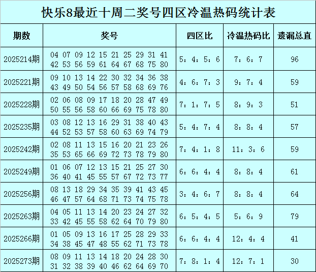 福彩风景8第2025279期开奖转头:0105061425323540454753626367687071727578,其中奖号四区比为4:4:3:9,冷温热码比为8:6:6。 福彩风景8第2025273期(上周二)开奖转头:0809111314182024283031323839404662646970,其中奖号四区比为7:8:1:4,冷温热码比为1:7:12。 易阳指风景8第2021185期周二奖号四区冷温热码分析(界说:遗漏0-1周的号码为热码,遗漏2-4周的号码温码,遗漏4周以上的号码