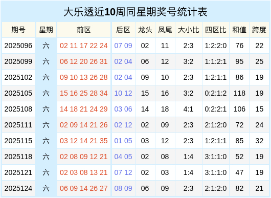 大乐透近十周同星期二奖号统计表