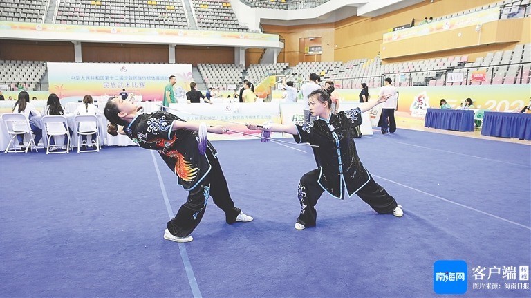 11月21日,在三亚学院体育馆,来自湖北代表团的通顺员张念念雯、刘海燕在切磋剑术。海报集团全媒体记者 陈若龙 摄