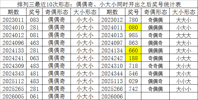 胪列三最近10次同期开罕见偶格局:偶偶奇和大小格局:小大小时其奖号差异为:083-281-081-463-281-063-483-481-483-281-061,下期差异开出号码为:780-080-985-863-660-188-718-546-029-742,耀眼统计见下表: