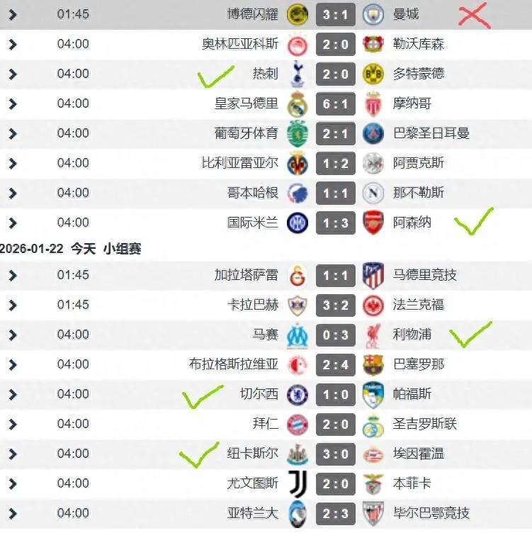欧冠第7轮英超6队战况:曼城客场1-3博德能干,热刺主场2-0多特蒙德,阿森纳客场3-1外洋米兰,利物浦客场3-0马赛,切尔西主场1-0帕福斯,纽卡斯尔主场3-0埃因霍温。