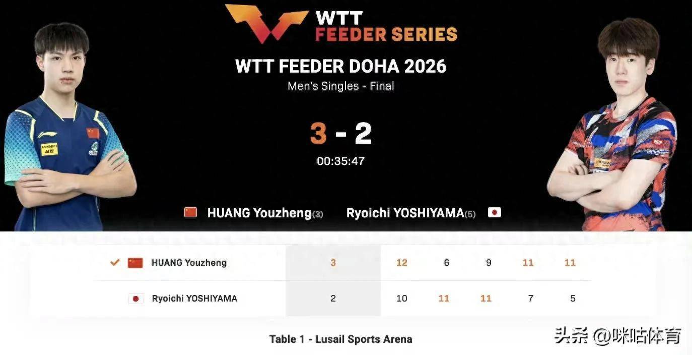 WTT支线赛多哈站迎来收官之战,国乒小将黄友政在男单决赛中献艺逆转好戏,以3-2力克日本选手吉山僚一,夺得冠军,五局具体比分为12-10、6-11、9-11、11-7、11-5。